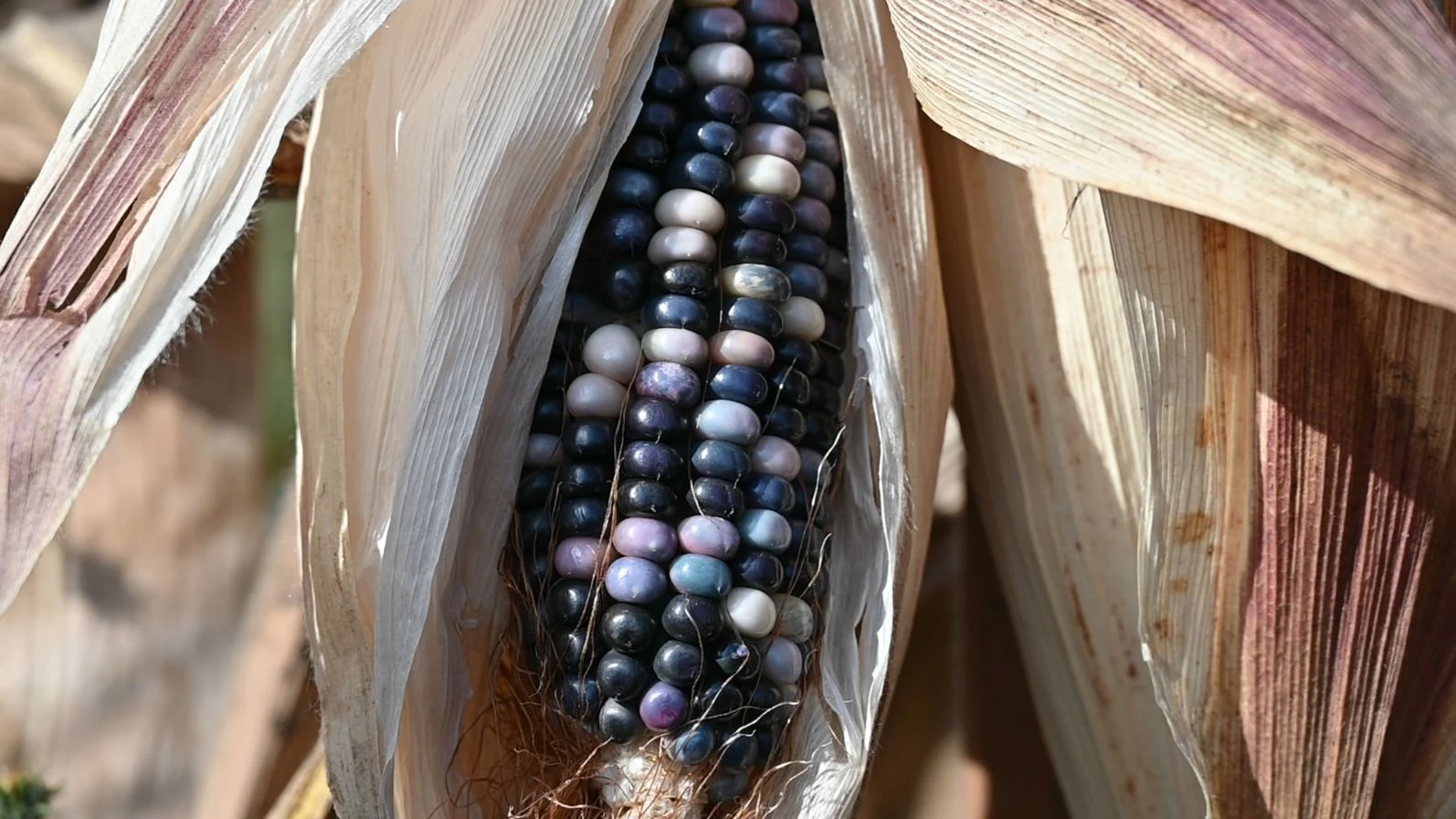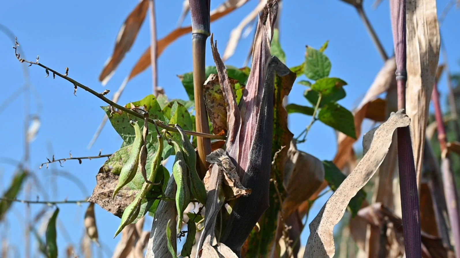 The dry, brittle leaves rustle as Ernesto Rancaño steps into the field ahead of us. A few steps in and he has all but vanished from view among the tall maize plants. Now, at the beginning of December, the fat corn cobs are nearly ready to be harvested. Carefully Rancaño peals the outer layer back to reveal the ripe kernels which are blue, almost black, with a few lighter, purple ones in between. On his one hectare plot he not only grows traditional red, blue and white maize, but also heritage beans, which climb all the way to the top of the maize stalks. The beans inside the well filled pods are huge and have a startling blue colour. Ayocote morado is just one of many Mexican heirloom bean varieties. Normally their colour ranges from lavender to deep shades of purple, ocean blue ones like those in Ernesto Rancaño's field are rare. He grows heritage maize and beans together in what's known as a traditional milpa system. Often, squashes can be found in milpas, too, maize, bean and squashes therefore are also known as the 'three sisters', each supporting the other.